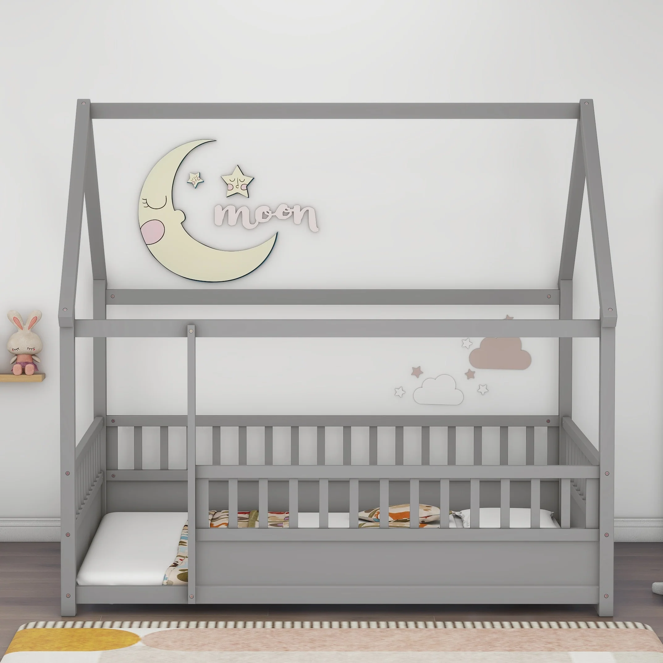 Grey Full Pine Floor Bed with Roof Frame and Fence Guardrails