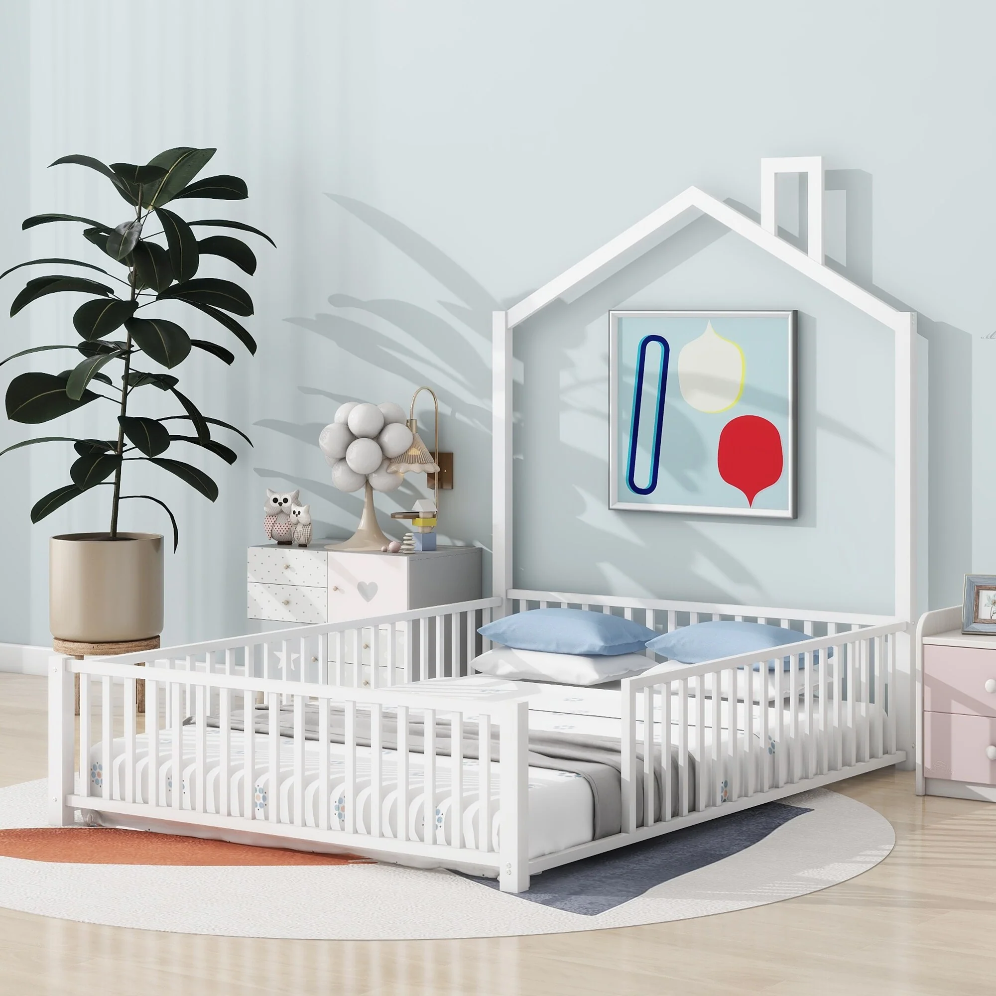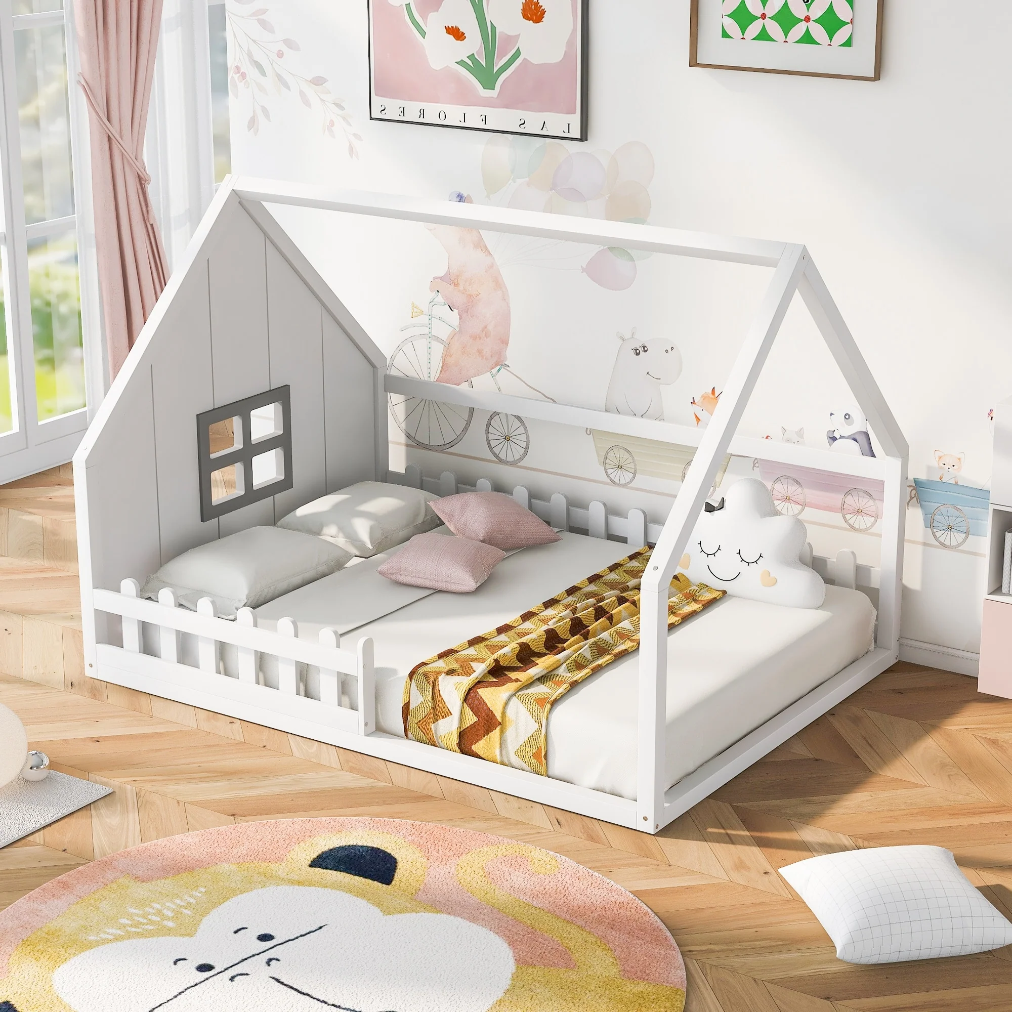 White Full Pine House Bed with Fence