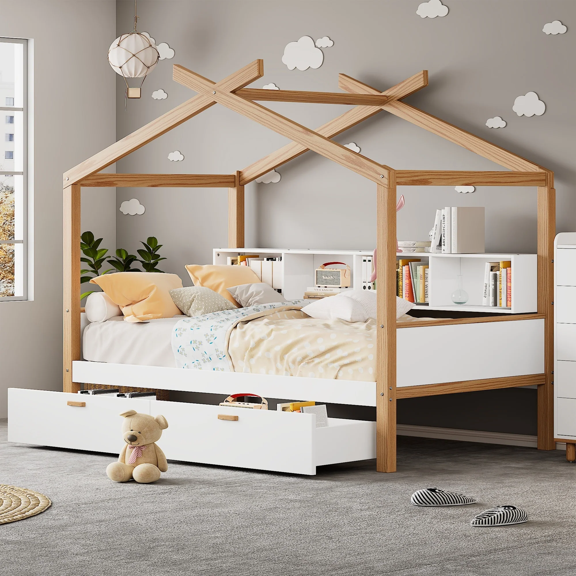 Twin Size Wooden House Bed with Two Drawers
