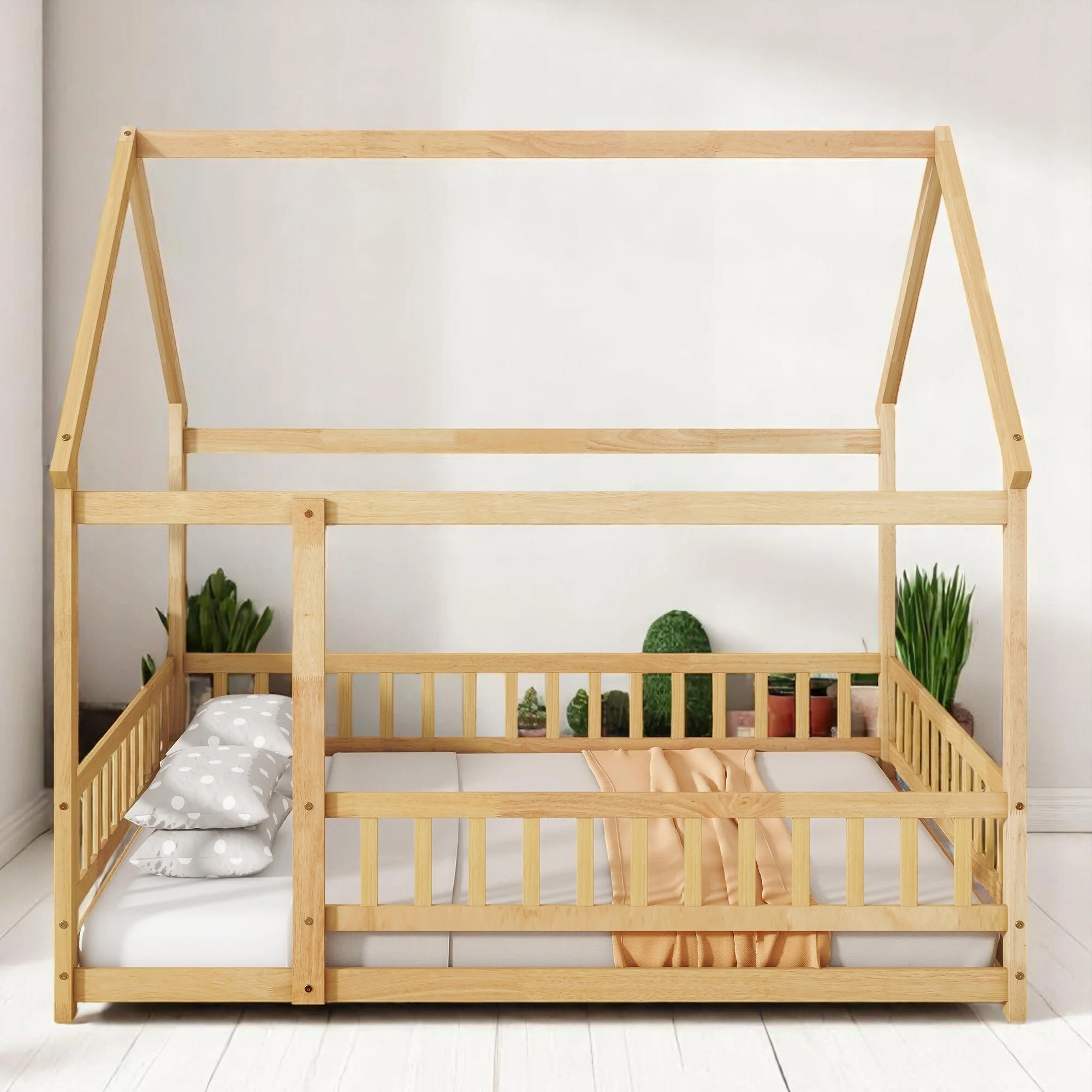 Twin Size Pine Tent-shaped Floor Bed with Guardrails & Door