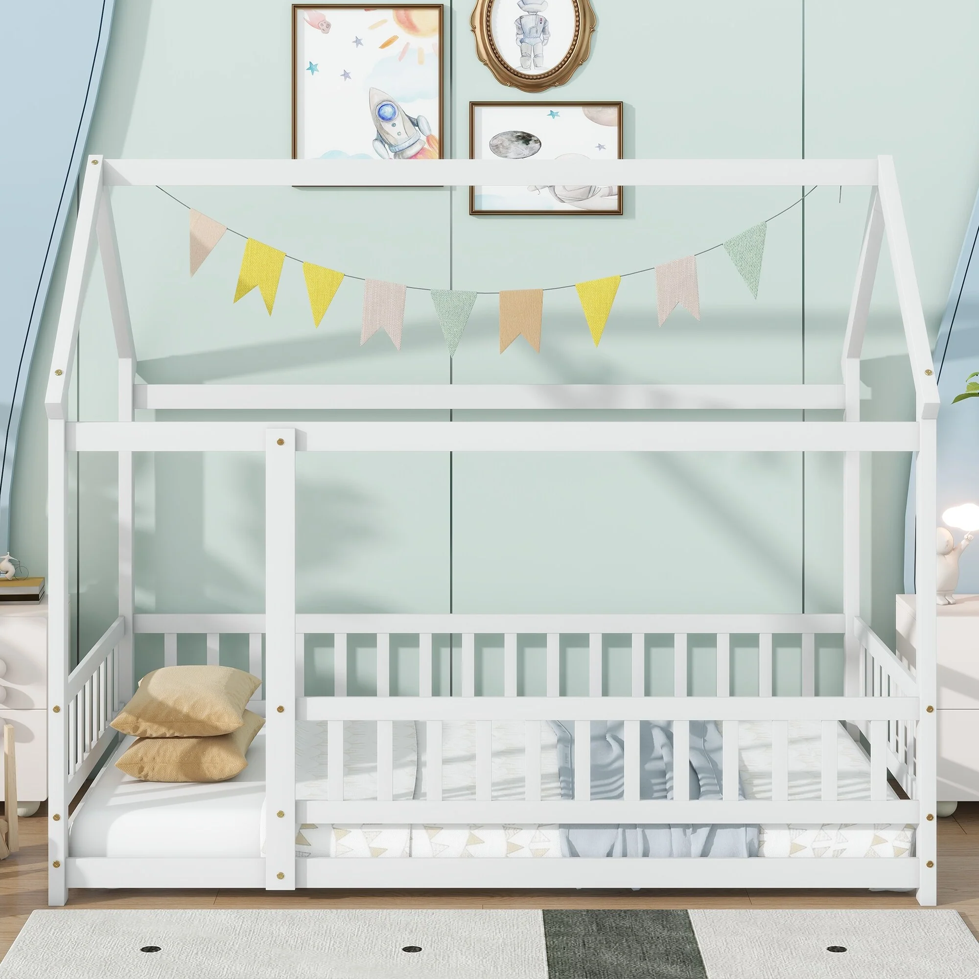 Twin Size Pine Wood House-Shaped Bed with Guardrails, No Door