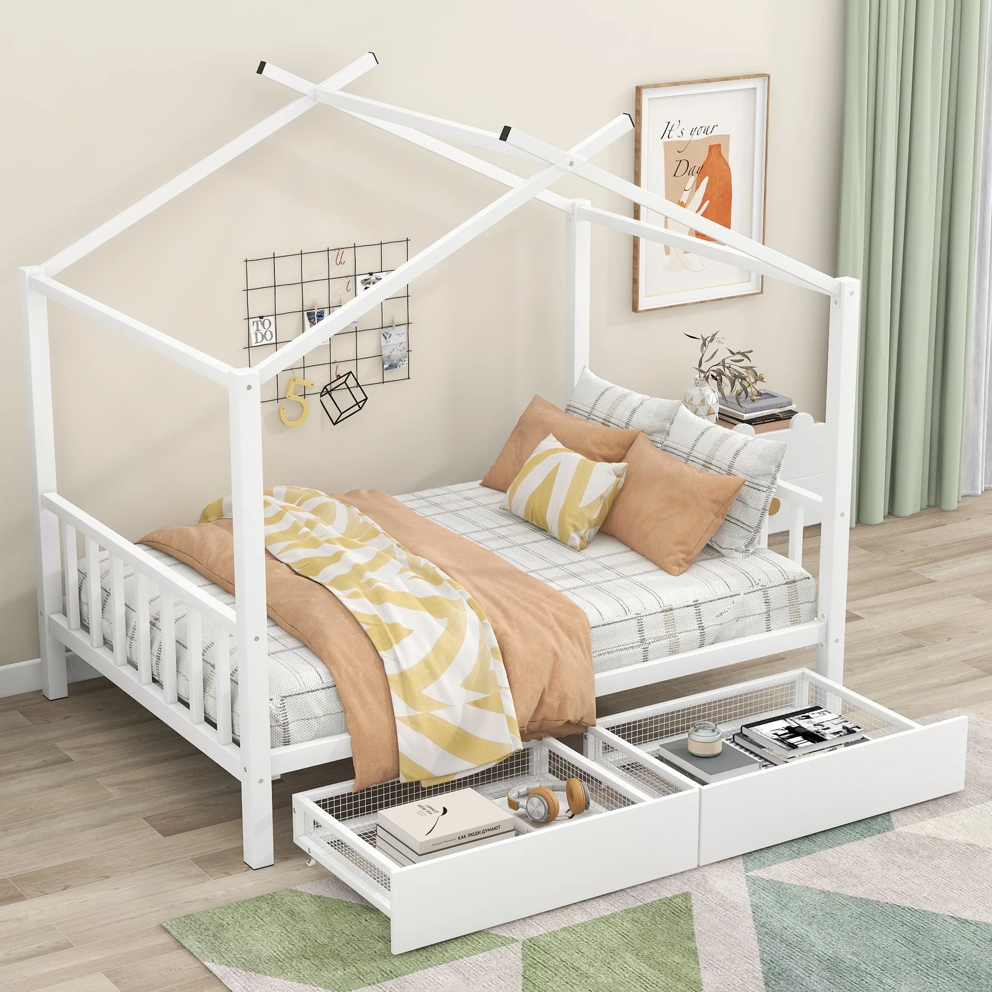 Twin Size House Bed with Two Storage Drawers and Guardrails