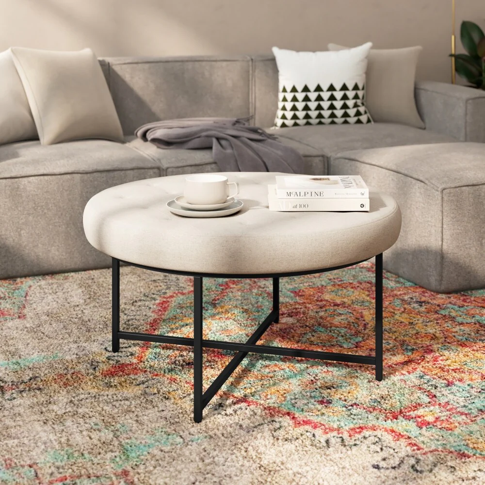 Tufted Round Cotton Linen Ottoman with Iron Frame