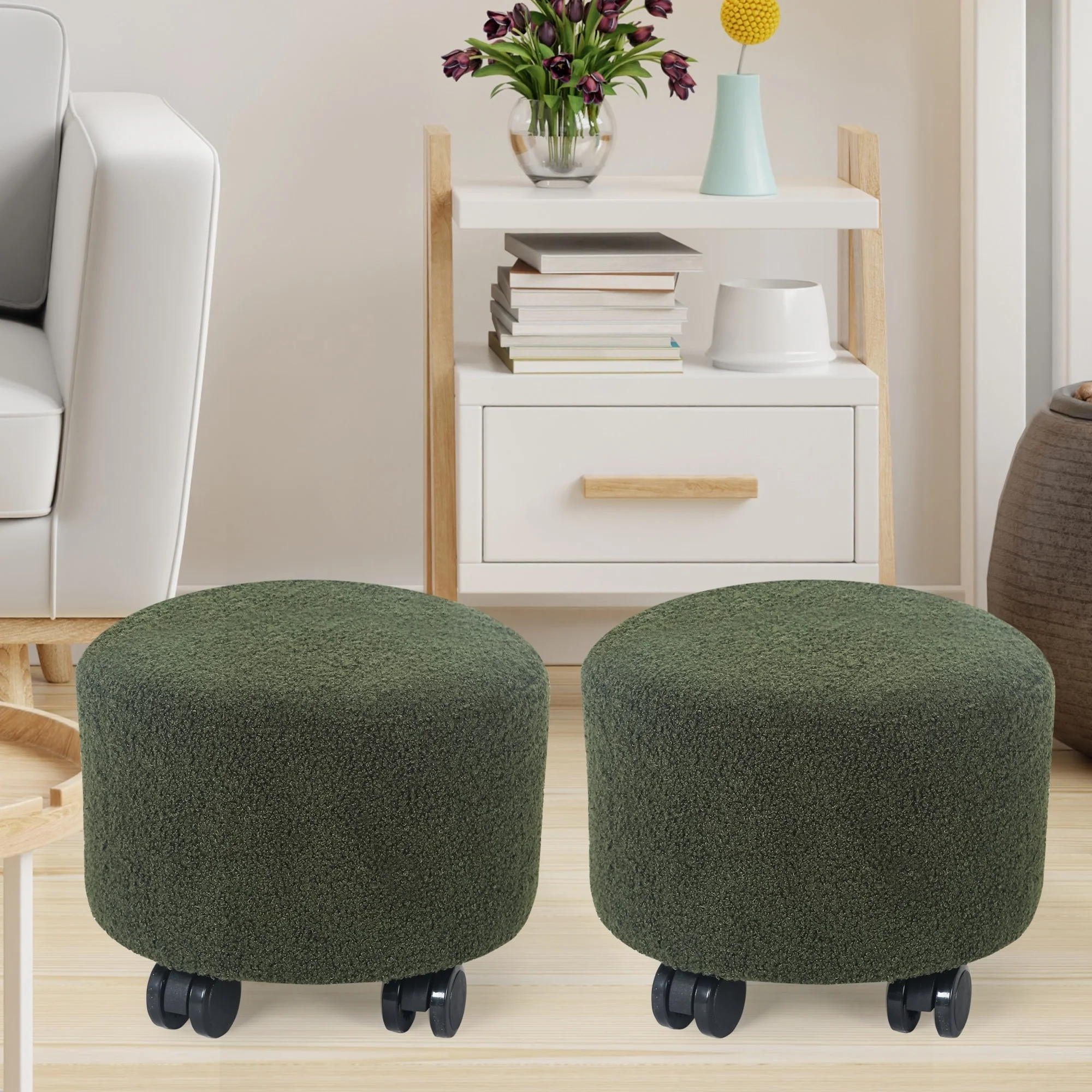 Adeco Set of 2 Round Velvet Foot Stool Ottoman with Casters