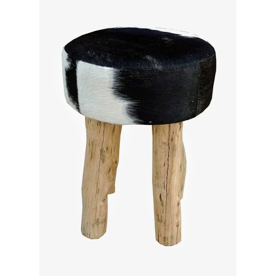 IVY Round Stool in Black & White Cow Hide with Rustic Wood Legs