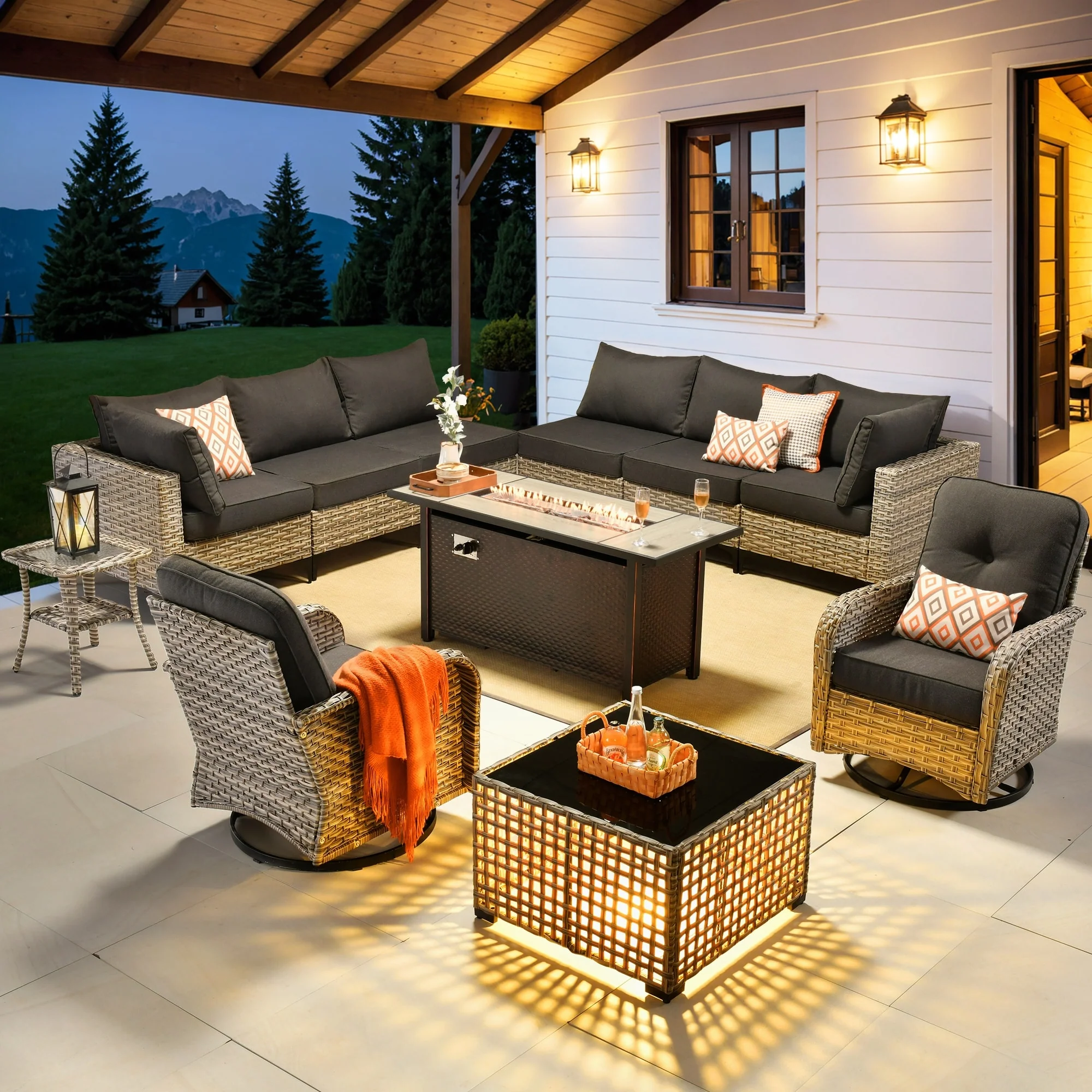 OVIOS 11 Pieces Outdoor Wicker Swivel Chair Set With Fire Table