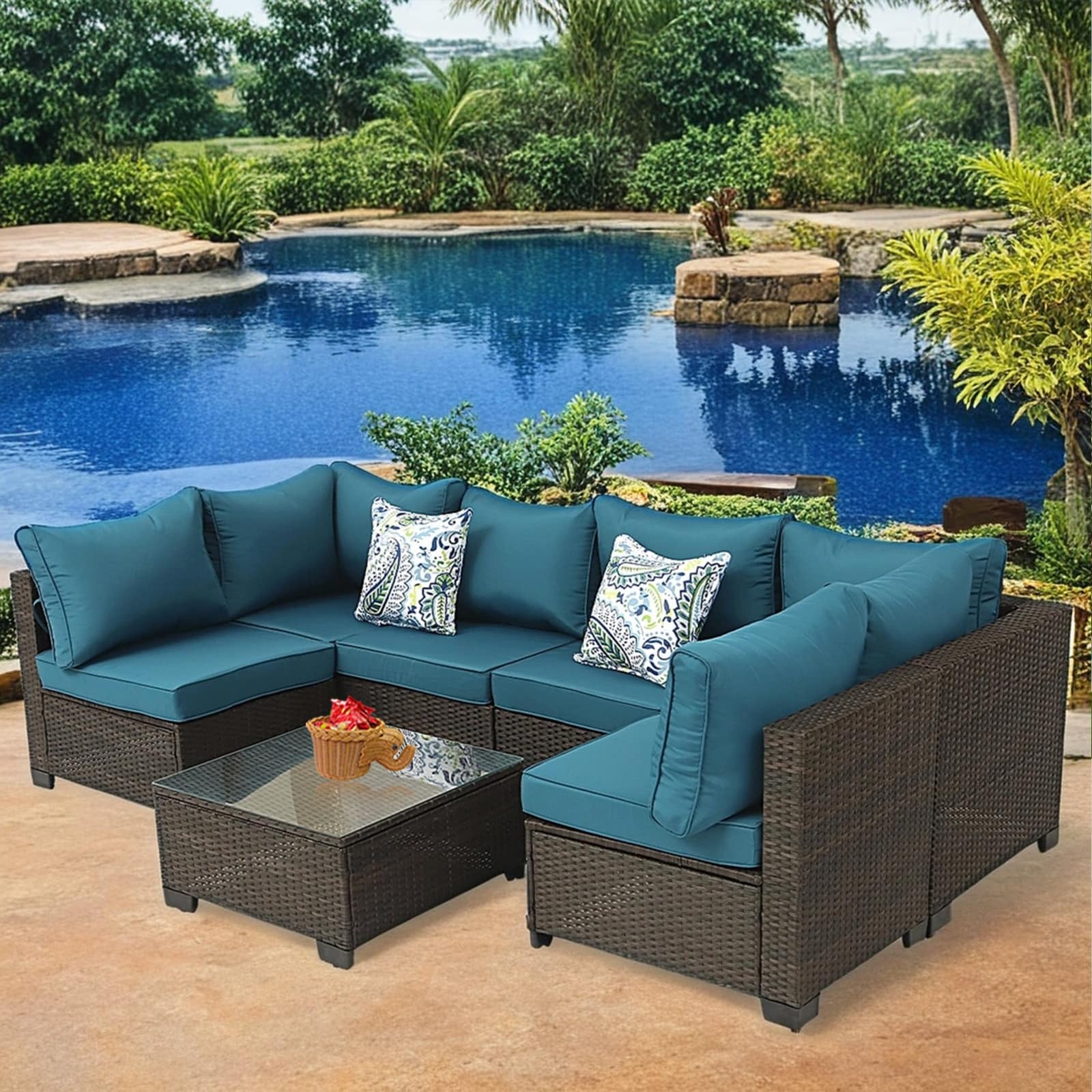 7-Piece Wicker Outdoor Sectional Set with Glass Table and Cushions