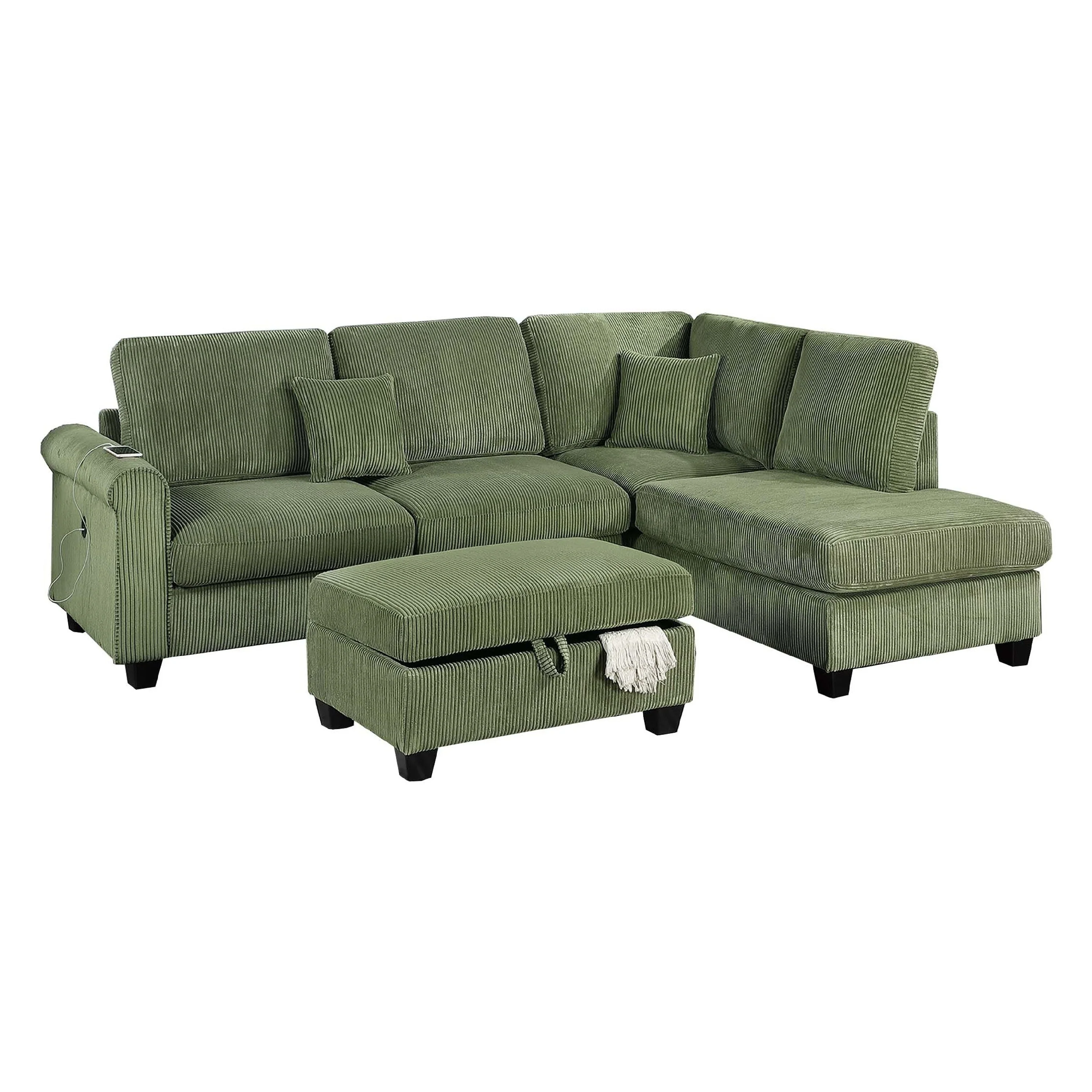 Roe 3pc Sectional Sofa Set w Chaise, Ottoman, 2 Pillows, Sage Green