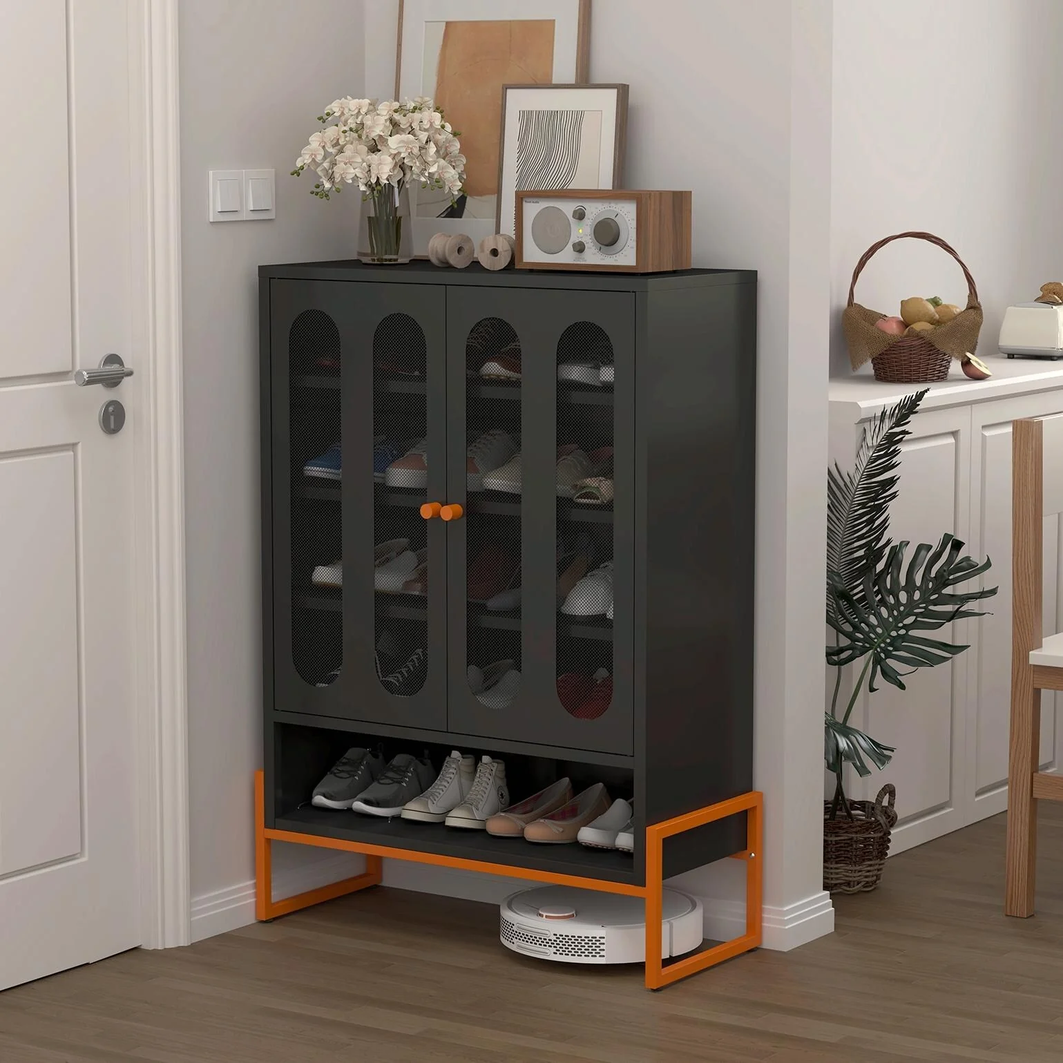High Shoe Cabinet with Adjustable Partitions & Mesh Doors