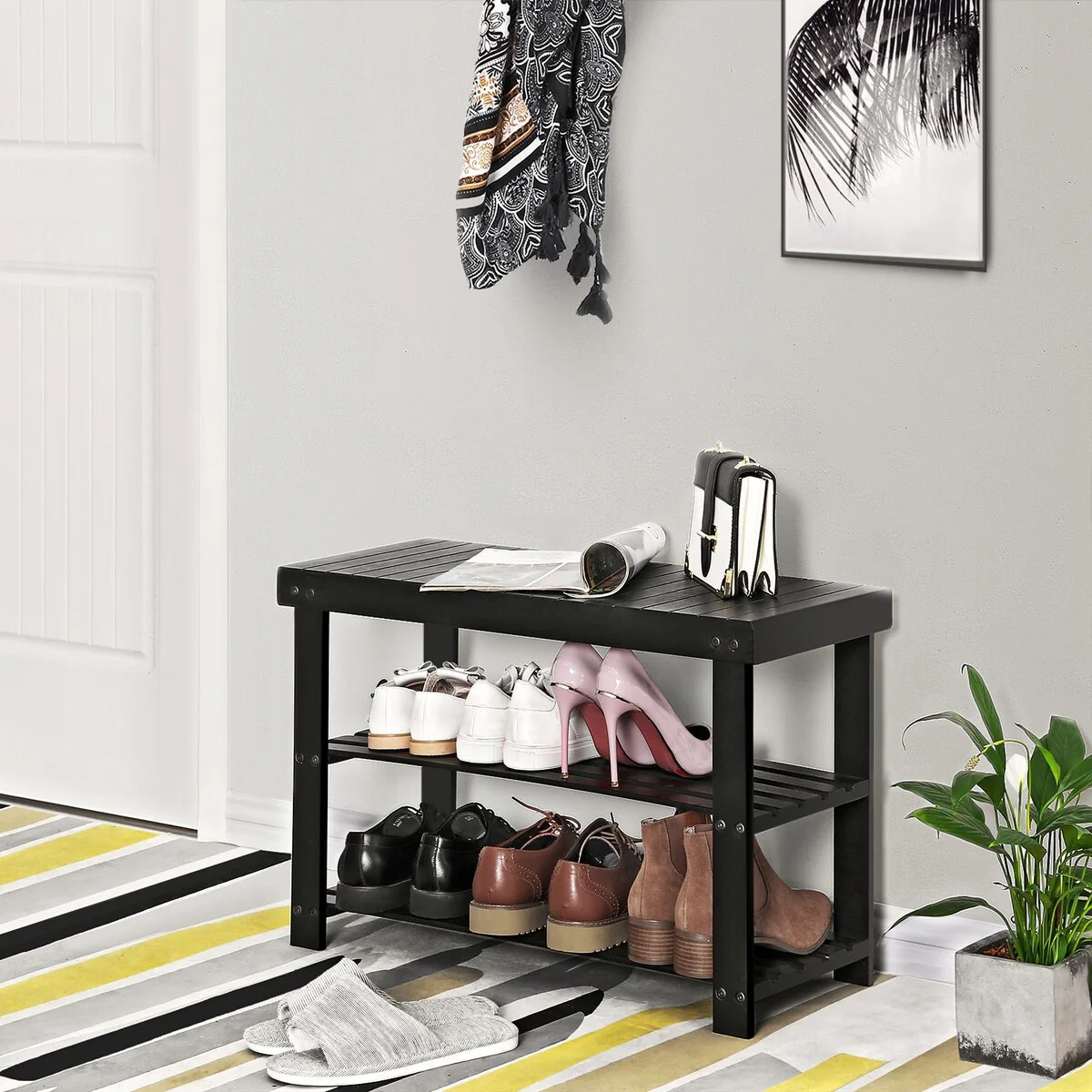 Entryway Storage Shoe Rack Bench with Cushioned Seat and Drawers