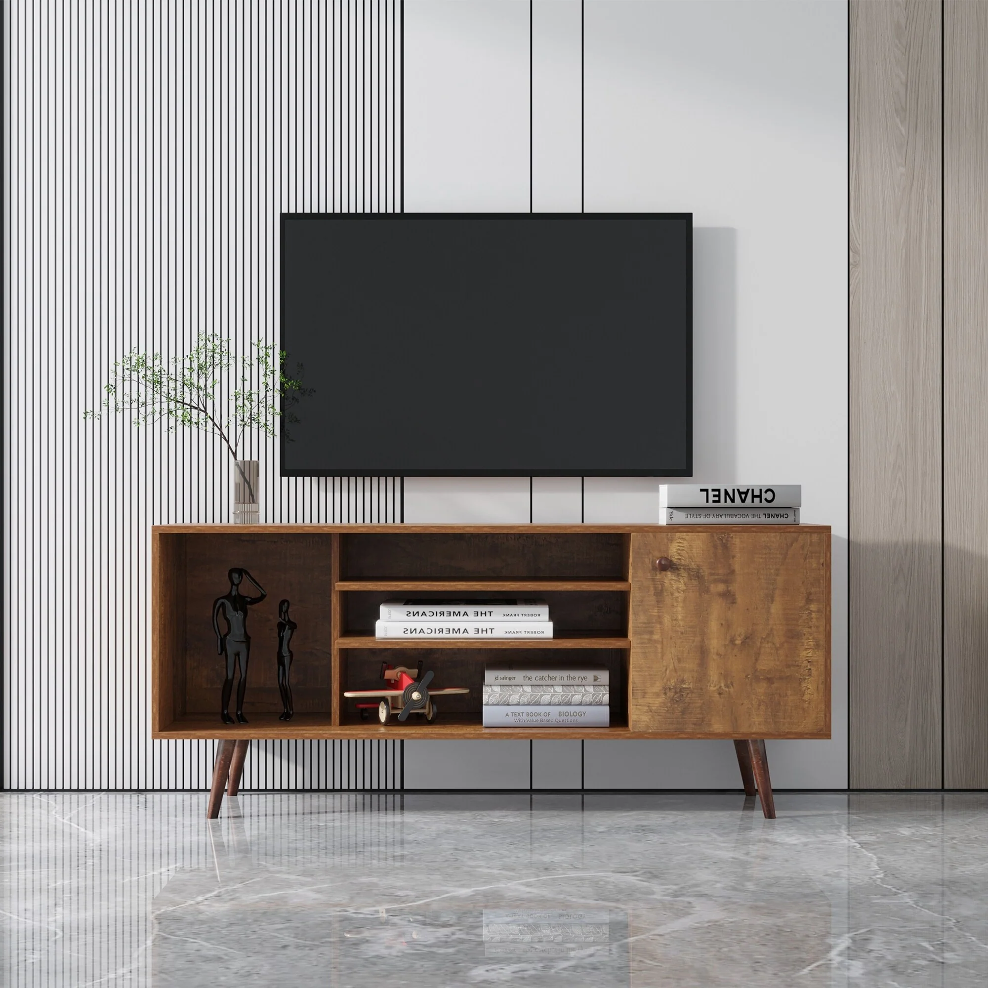 Walnut 53 TV Stand with Wood Legs, Storage & Shelves